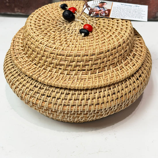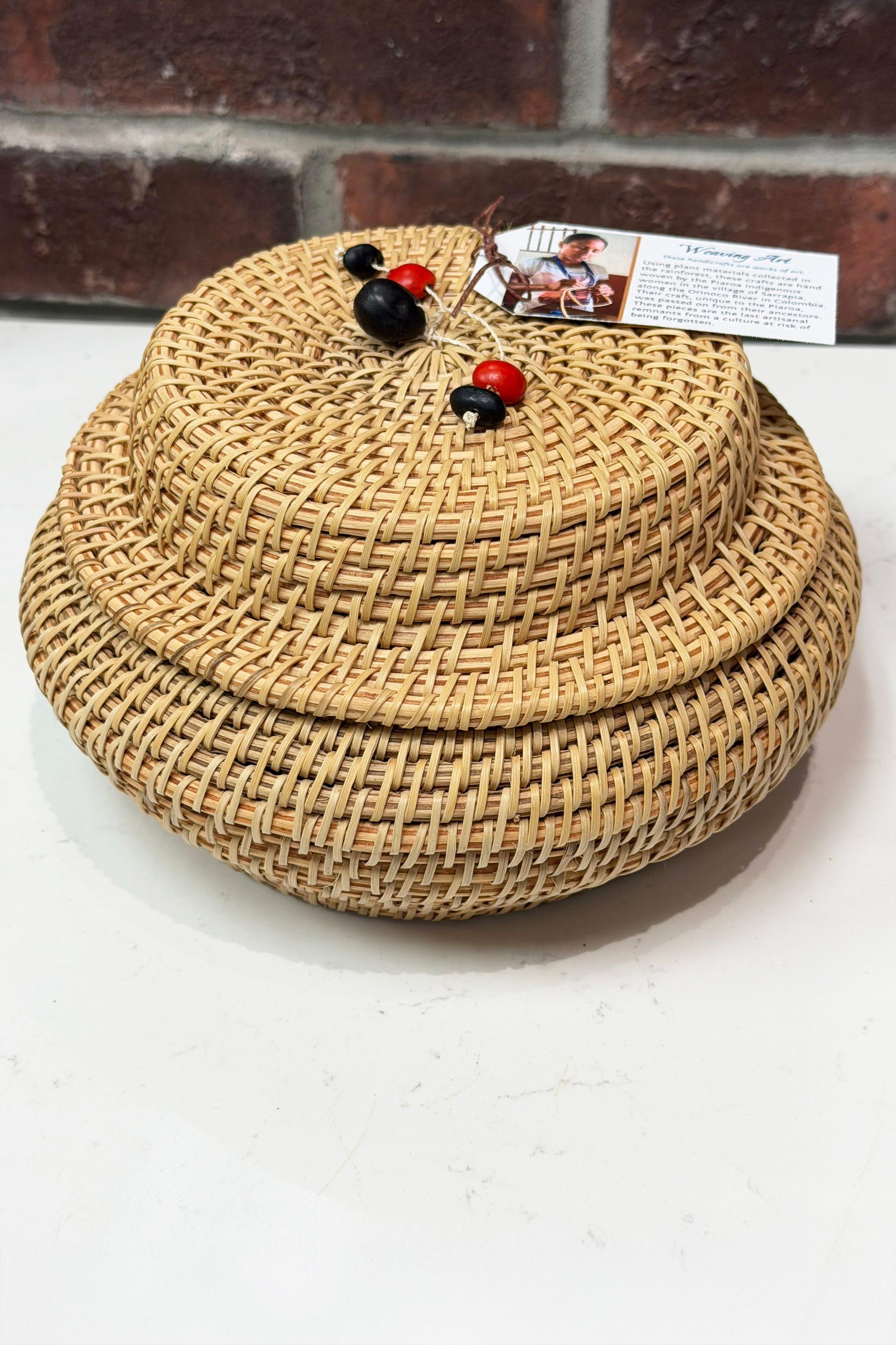 These exquisite gift baskets are filled with an assortment of our homemade chocolate chip biscotti (4 of them), chocolate brownie, and 3 caramel turtles. The baskets are meticulously crafted by the indigenous Piaroa women, who live along the banks of the Orinoco River in the Amazon region. The Piaroa handicraft of weaving is an artform at risk of being lost with future generations as the younger children move from the Orinoquia region to the city. The baskets are skillfully woven with materials collected in the rainforest including seeds such as maize, rosary pea, and deer eye. Each basket is unique, a true work of art you can reuse for storage or display. Dimensions: round 7.5” wide, 5” tall