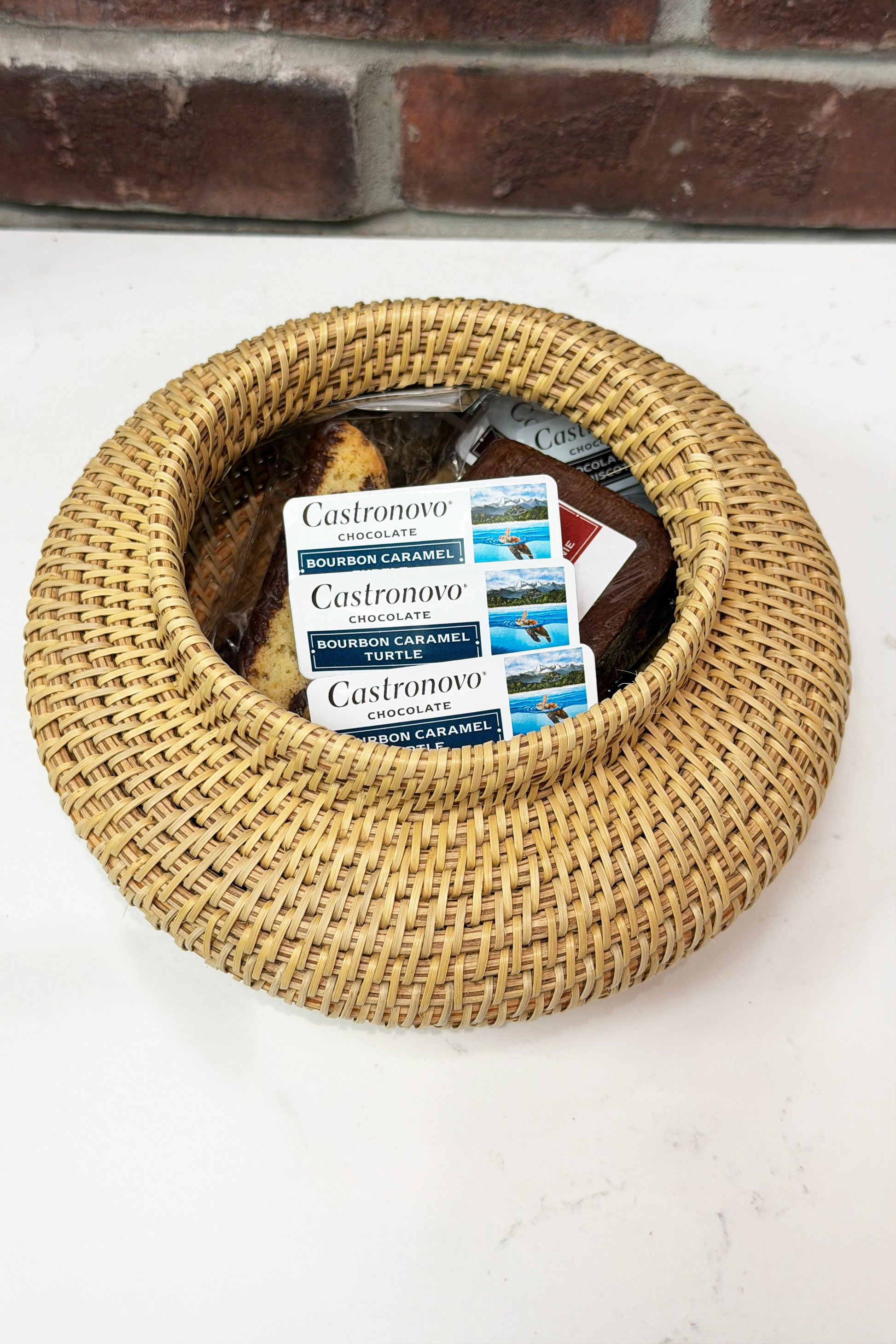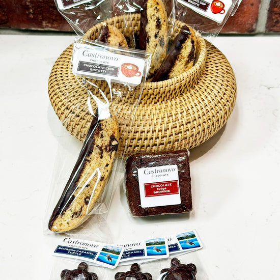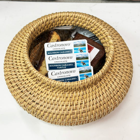 Flavor Profile: This Amazonian gift basket is filled with 4 chocolate chip biscotti, 1 brownie, and 3 caramel turtles, packaged in a one-of-a-kind handmade basket that is 7.5” wide and 5“ tall. After your loved one enjoys their chocolate, they have a small token to keep small keepsakes inside and to remember your thoughtfulness. You can include a note for your recipient at the checkout that we will inscribe for you on a postcard. Qualifies for Free Shipping! This item ships via priority mail only.