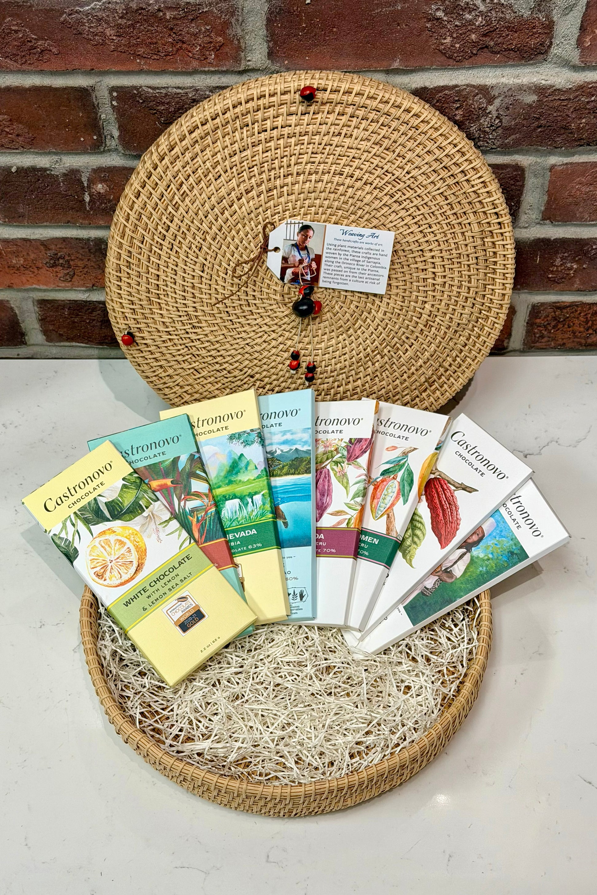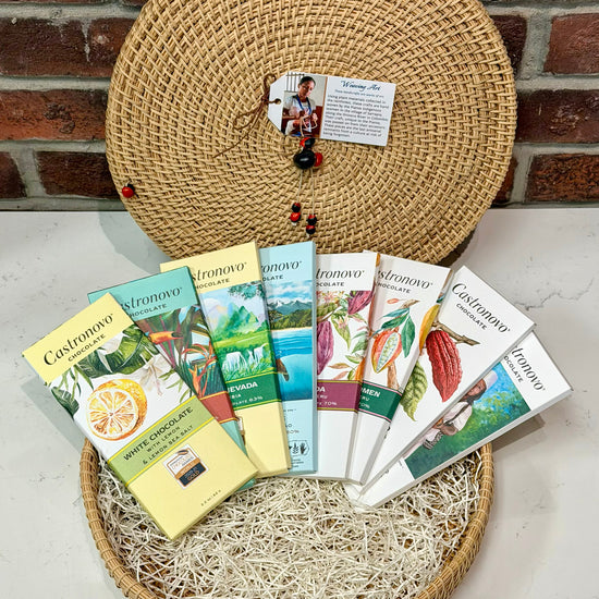 Flavor Profile: Celebrate the flavors of the rainforest with this handcrafted gift basket, filled with our most beloved dark, milk, and white chocolate bars. Each bar is made with ethically sourced cacao from indigenous communities and smallholder farmers across Latin America, supporting biodiversity and sustainable livelihoods. Contains 3 dark milk chocolate bars, 4 dark chocolate bars, 1 lemon white chocolate bar. Substitutions for all milk chocolate or all dark chocolate can be made in the notes section at checkout.