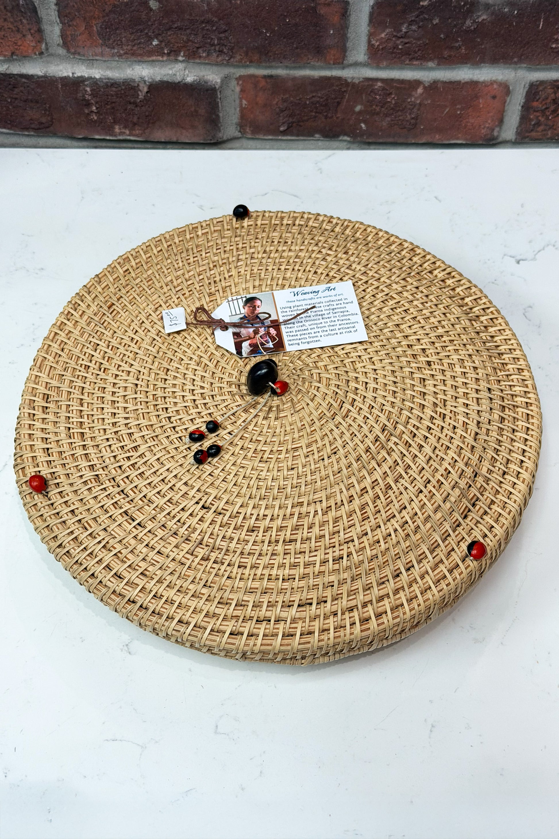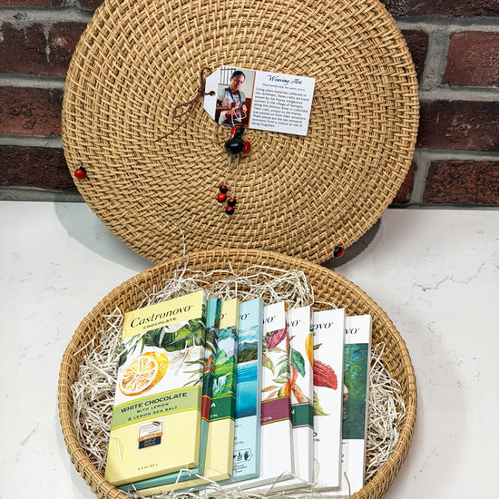 These exquisite gift baskets, filled with an assortment of our chocolate bars (3 milk chocolate, 1 white chocolate, 4 dark chocolate), are meticulously crafted by the indigenous Piaroa women, who live along the banks of the Orinoco River in the Amazon region. The Piaroa handicraft of weaving is an artform at risk of being lost with future generations as the younger children move from the Orinoquia region to the city. The baskets are skillfully woven with materials collected in the rainforest including seeds such as maize, rosary pea, and deer eye. Each basket is unique, a true work of art you can reuse for storage or display. Dimensions: round 12” wide, 3” tall