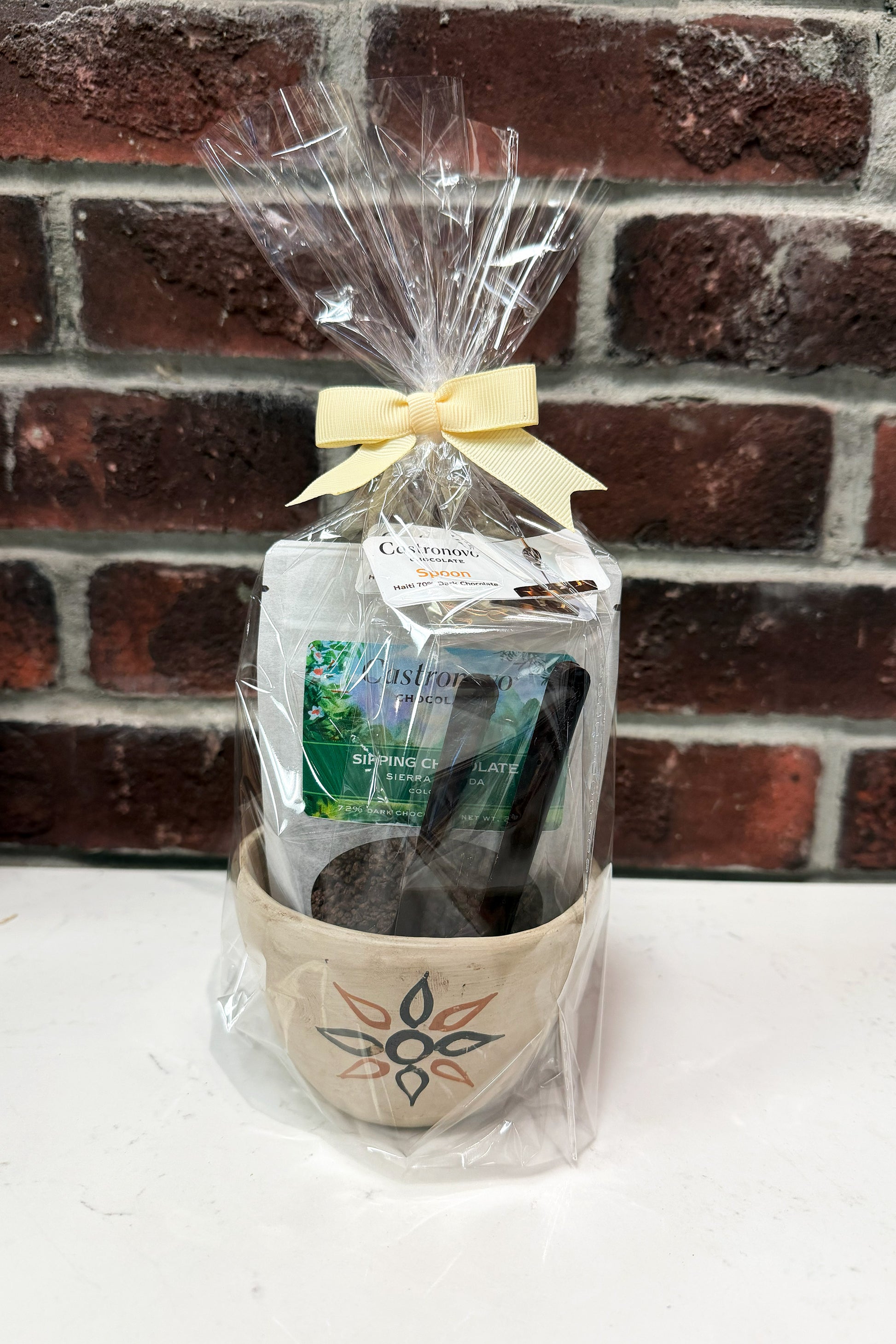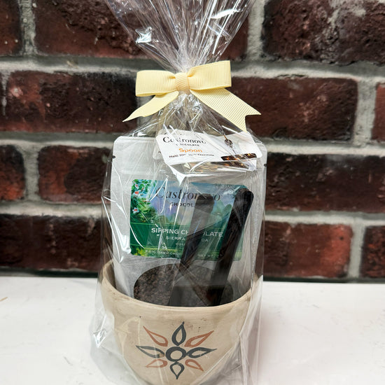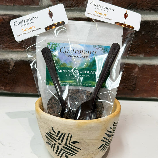 Flavor Profile: A one‑of‑a‑kind gift that blends tradition and craftsmanship. Each set features a handmade ceramic pot from Chazuta, a renowned pottery community in Peru’s Amazon, paired with a single serving of our rich Sierra Nevada sipping chocolate and two dark chocolate spoons crafted from Haiti 70% dark chocolate. This thoughtful combination celebrates cultural artistry and fine chocolate, making it a memorable gift for any occasion. Choose a mug with either a floral or geometric design. To learn more about Chazuta click on the "origins story" section below.