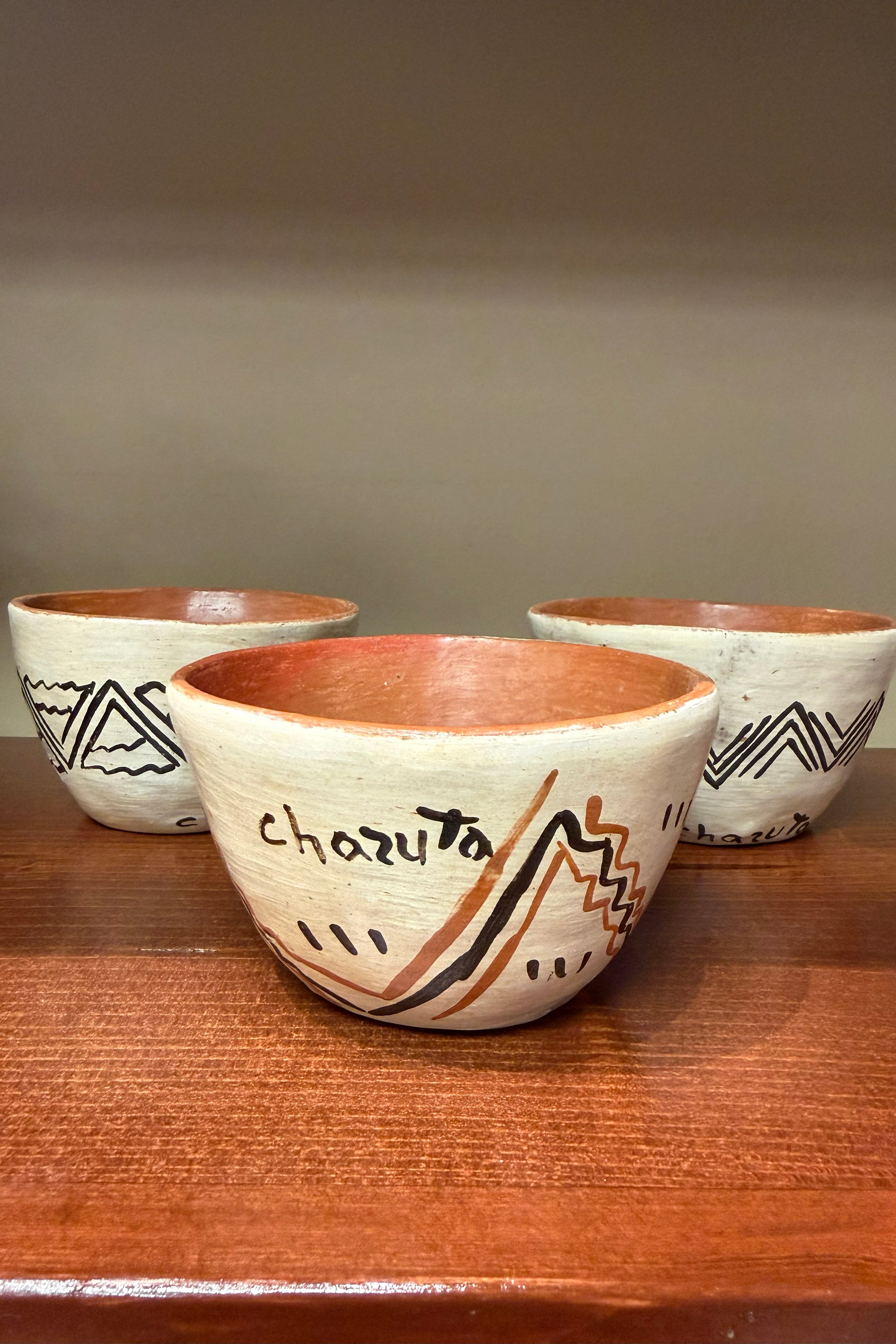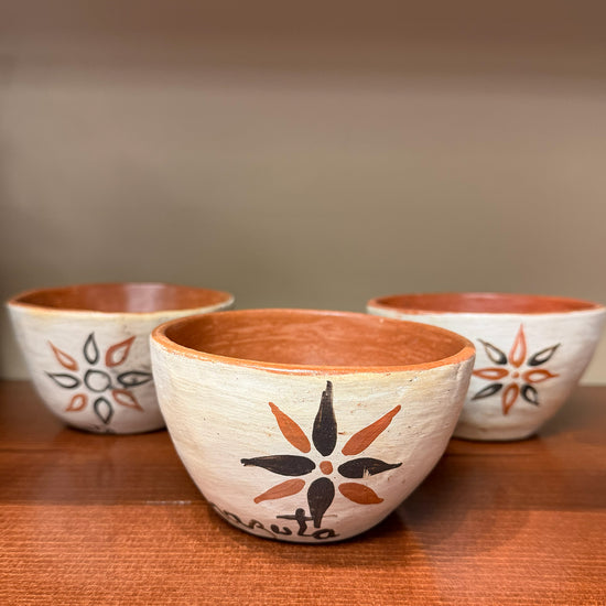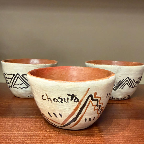 In 2012, Chazuta pottery was designated as one of Peru's national cultural heritage sites. Rooted in ancestral traditions, it embodies the community’s identity, history, and values. Distinguished by its symbolic designs and time‑honored techniques passed down through generations, this craft is both an artistic expression and a vital source of economic livelihood for the indigenous women living at the edge of the Amazon. Each pot is a unique piece made with local clay and wood fired. The dimensions are about 3.5 inched diameter and 3" tall. These can be used as cups or bowls. They are perfect for hot chocolate, tea, yogurt or ice cream.