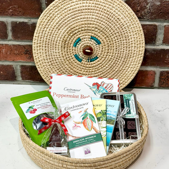 Flavor Profile: This handmade Amazonian gift basket is filled with an assortment of our bean-to-bar confections including our Peppermint Bark (10 oz), Bourbon caramels (12 pieces), Dark Chocolate Covered Cherries, three chocolate bars: White Chocolate with Lemon & Lemon Salt, Arhuacos Milk Chocolate with Sea Salt, Awajún Women, Peru 70% dark chocolate, and a solid milk chocolate father Christmas. Customization is available if you would like to substitute chocolate bars for all dark or all milk chocolate. Please inform us in the notes section at checkout for any substitutions. You may also include a note for your recipient that we will inscribe for you on a postcard. *Qualifies for free 2-day express shipping!