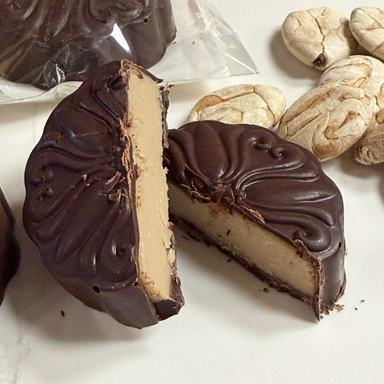 Flavor Profile: Our gourmet twist on a seed butter cup is completely nut-free. The filling features macambo (Theobroma bicolor), a cacao cousin with a flavor reminiscent of macadamia nuts. We blend the seeds with cocoa butter to create a rich chocolate, then whip it into a smooth ganache for the cuvette’s center. This is perfectly paired with our Chuao, Venezuela 72% dark chocolate shell.