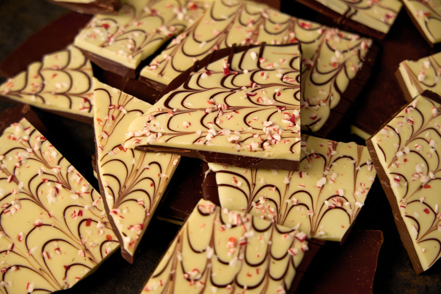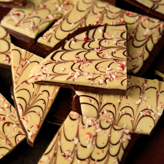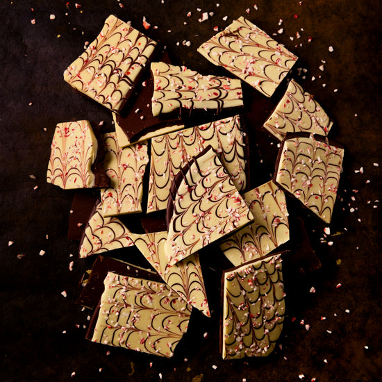 Flavor Profile: A seasonal favorite…We handcraft our peppermint bark by starting with a layer of our bean-to-bar dark chocolate on the bottom. Next, we layer peppermint-flavored white chocolate on top. Then, we sprinkle it with organic crushed candy cane that is naturally colored with beet juice rather than dye. We decorate the peppermint bark with a beautiful dark chocolate swirl design, making each piece a little work of art with magnificent taste.