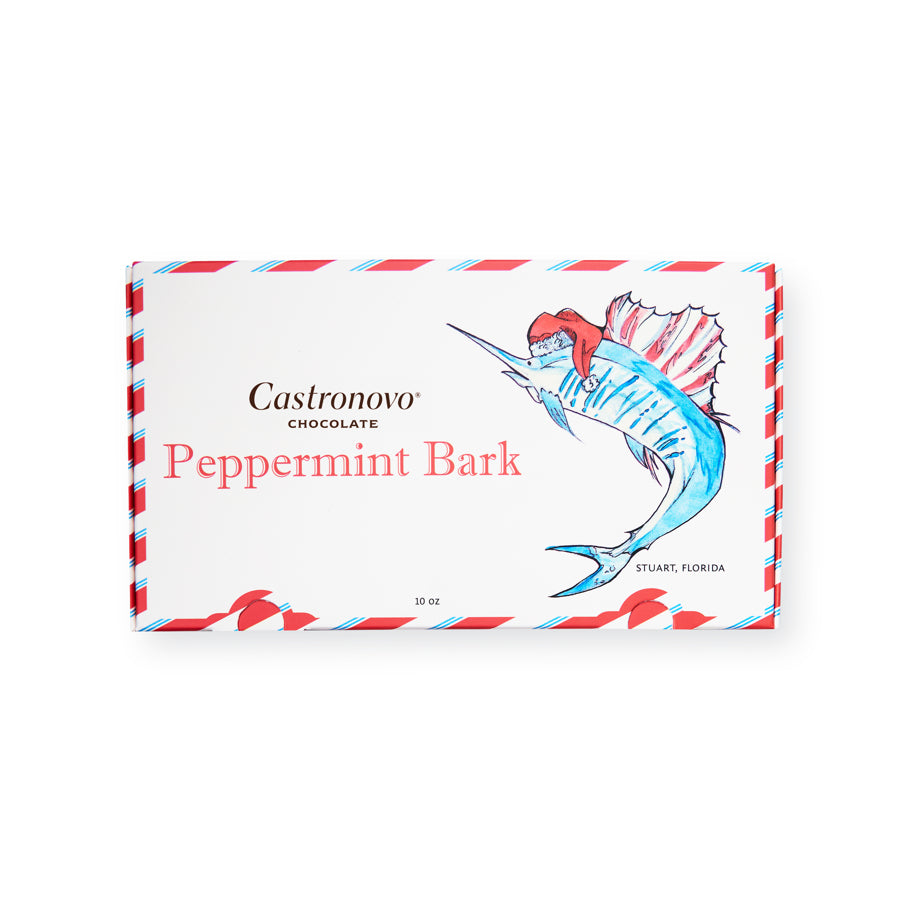 This year’s peppermint bark is made with a new origin, a rich fudgy 70% dark chocolate from the PISA women's cooperative of Haiti for the bottom layer. We use our homemade white chocolate for the top layer. Our bean-to-bar workshop is in Stuart, Florida, known as the “Sailfish Capital of the World” so our peppermint bark box honors this tradition with a playful Christmas sailfish, a design made by Denise’s young daughter.