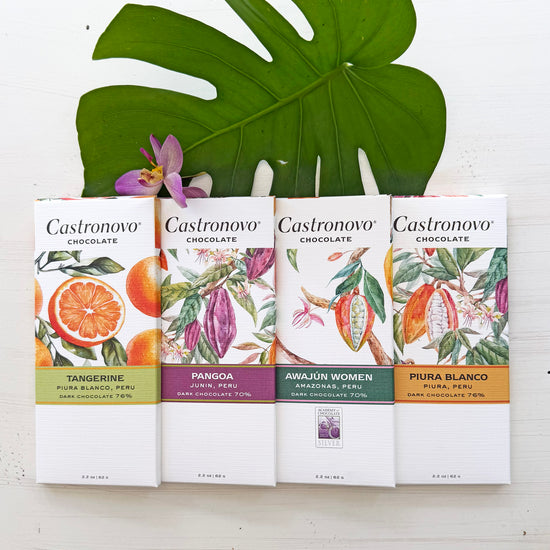 Flavor Profile: This curated gift set features four handcrafted dark chocolate bars, each made from her favorite cacao selections across three distinct regions—Piura, Amazonas, and Junín. From the bright citrus and delicate nuttiness of Piura to the deep cherry and fig notes of Pangoa, and the warm vanilla and spice of indigenous Awajún cacao, each bar offers a unique flavor journey through Peru’s diverse cacao terroirs.
