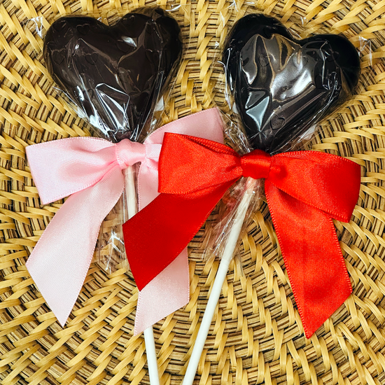 For Valentine's Day, we mold our bean-to-bar fine flavor chocolate into heart shaped lollipops. Each heart is about 2.5 inches wide and 1.25 oz of solid milk or dark chocolate. Milk chocolate lollipops are packaged with a pink bow and dark chocolate lollipops with a red bow. You will need to choose dark or milk chocolate.