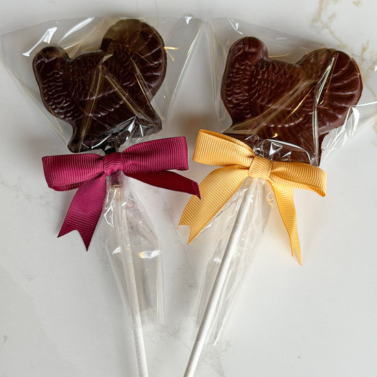 Flavor Profile: For Thanksgiving, we mold our bean-to-bar, fine-flavor chocolate into turkey shaped lollipops tied with a cute grosgrain bow. These make a great addition to your Thanksgiving place setting. Each turkey is about 3 inches wide and 1 oz of solid milk (gold bow) or dark chocolate (cranberry bow). You can choose the chocolate type below. Lollipops are priced individually.