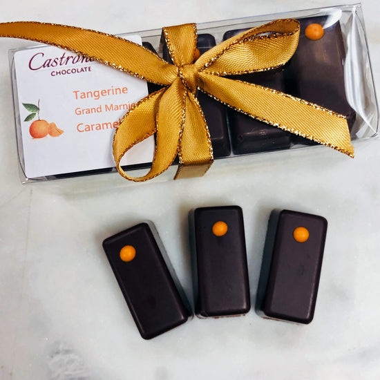 The tropical fruit flavors of our new Tangerine Piura Blanco dark chocolate pair beautifully with Grand Marnier and caramel. These delicious bonbons are filled with a soft caramel center infused with our dark milk chocolate, tangerine essence and Grand Marnier liquor. Each bonbon is coated in our Tangerine Piura Blanco 76% dark chocolate. These bonbons only contain a little Grand Marnier for flavor complexity and do not taste overwhelmingly of alcohol. The come beautifully packaged in a box of 10 pieces.